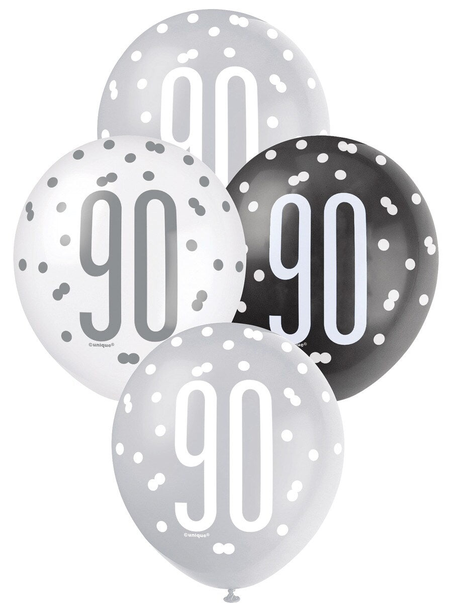 Black, Silver & White Assorted Latex Balloons 30cm (12") – Pack of 6 (90th Birthday)