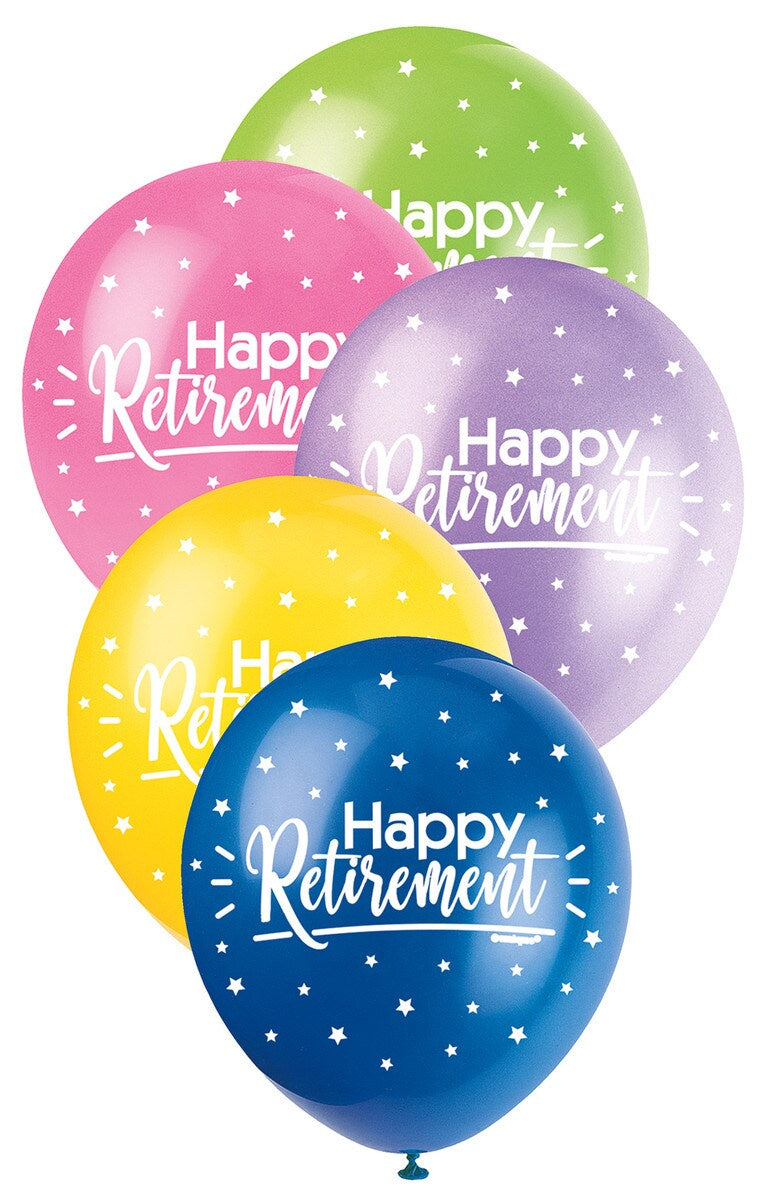 Complete Set – Includes 5 high-quality 30cm (12") pearl balloons, each featuring a "Happy Retirement" message.